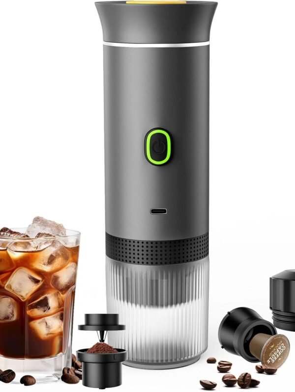 - Portable 3-in-1 Coffee Maker, USB-C Self-Heating, Compatible with Ground Coffee and Capsules, Grey