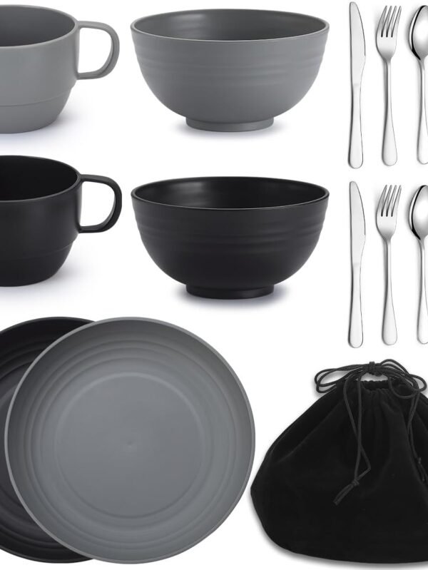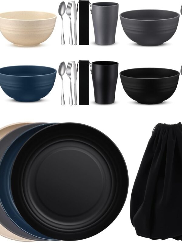 4 Sets Camping Mess Kits for 4 Person Camping Silverware Set Include Cup, Bowl, Plate, Knife, Spoon, Fork Cutlery Set Unbreakable Wheat Straw Dinnerware Utensils for Travel, Picnic, Outdoor