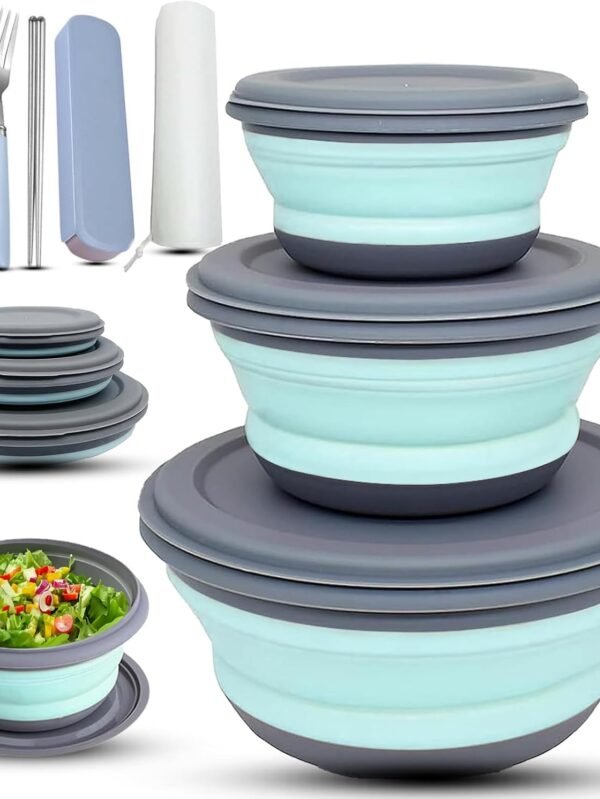 Camping Bowl, 3 PCS Food Grade Silicone Collapsible Bowl Lunch Box Salad Bowl with Lid, Expandable Food Storage Containers Set with Free folding tableware and storage bag (Blue)