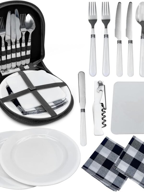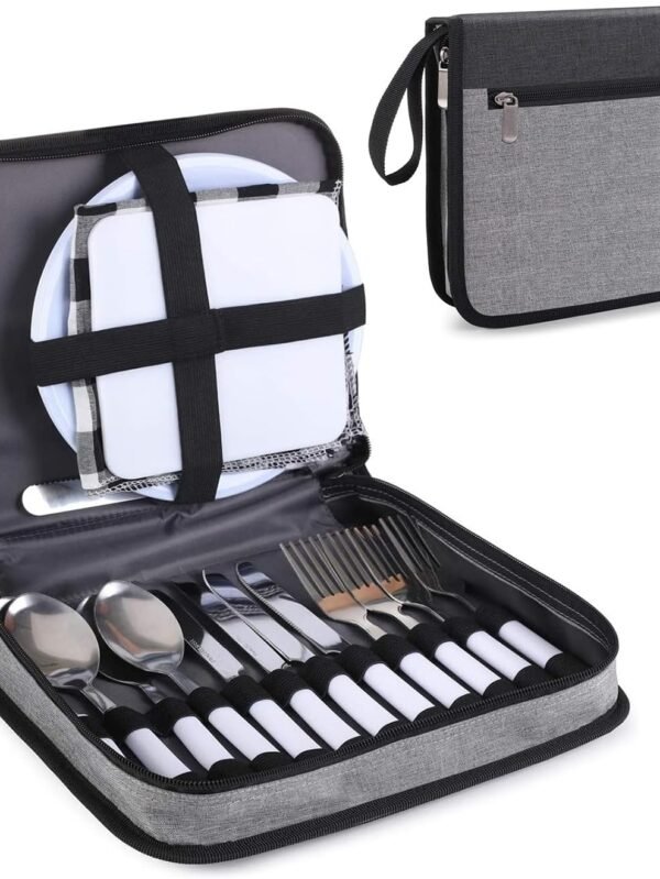 Picnic Set for 4 - Includes 26 Pcs, Portable Travel Utensils with Case, Reusable Camping Cutlery Plates, Stainless Steel of Spoons and Forks, for Hiking, Camp, BBQ, Gift (Grey)