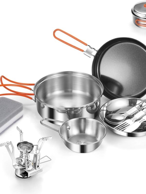 10pcs Stainless Steel Camping Cookware Camping Pot and Pan Set with Portable Camping Stove Camping Mess Kit with Plates Bowls Forks Knives Spoons for Hiking Backpacking and Picnic