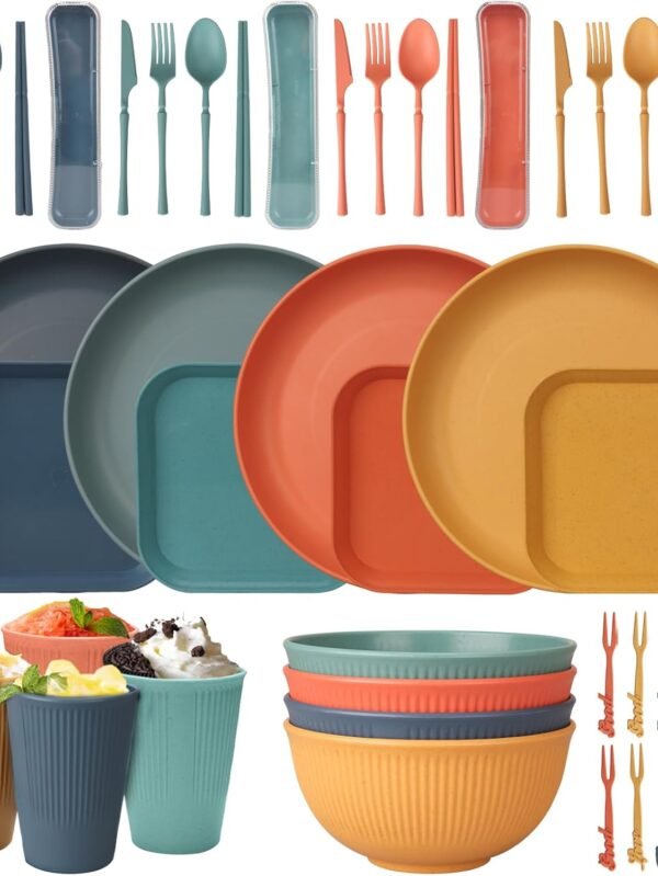 48 Pcs Dinnerware Sets, Unbreakable Plates and Bowls Sets, Reusable Dinnerware Sets for 4 People, Travel Camping Picnic Home Party Cutlery Set, Dishwasher Microwave Safe Dishes