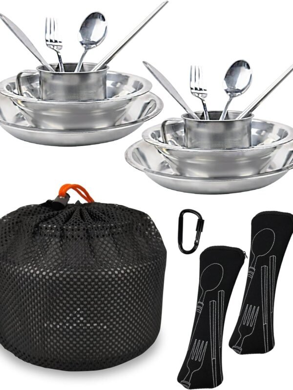 Outdoor Camping Cookware Mess Kit Polished Stainless Steel Dishes Camping Utensils Portable Tableware with Plates Cups Spoons Forks Knives Mesh Bag for Backpacking Hiking