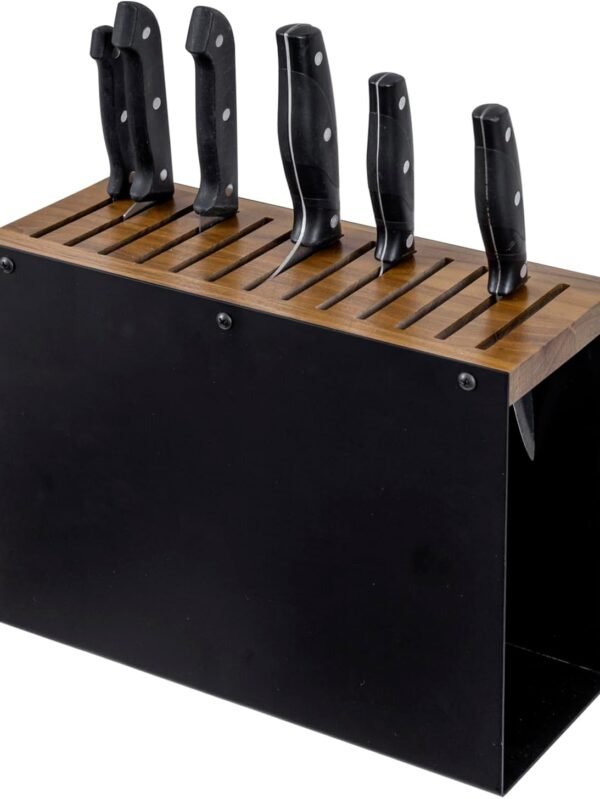 13 Slot Deluxe Natural Acacia Solid Wood and Matte Black Metal Universal Knife Block, Kitchen Countertop Cutlery Holder, Safe Blade Storage Knives Rack
