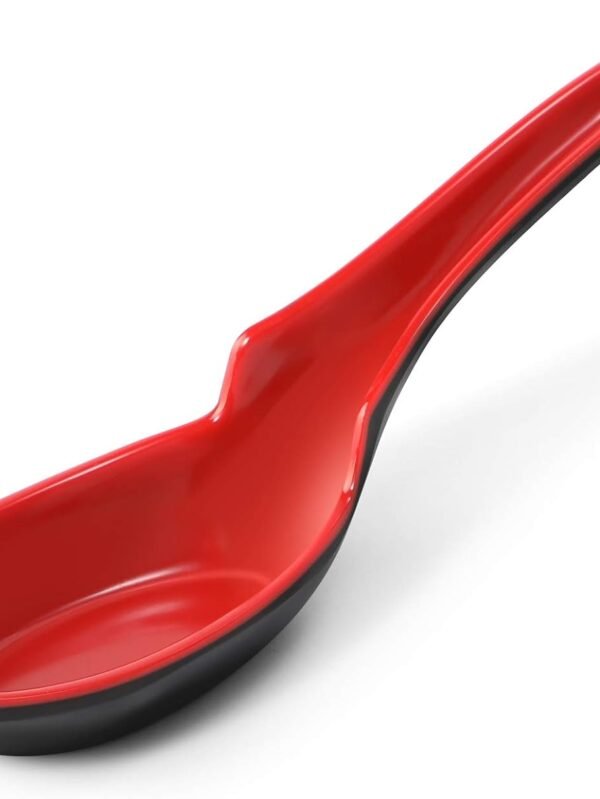 12 PACK Asian Soup Spoons, Rice Spoons, Melamine Chinese Won Ton Soup Spoon For soba, pho, ramen, Noodle, Korean Style Large Spoon with Long Handle- Notch and Hook Style, Red & Black