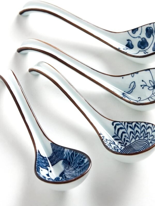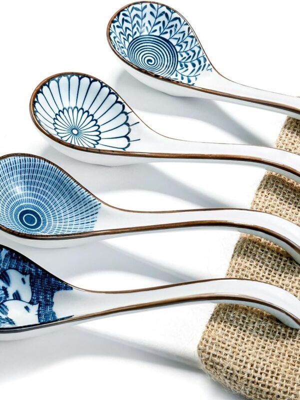 4 Pieces Asian Ceramic Soup Spoons Set Long Handle Chinese Spoons Retro Blue Japanese Ramen Bowl Soup Spoon Suitable for Gravy, Cake, Oatmeal, Dumplings