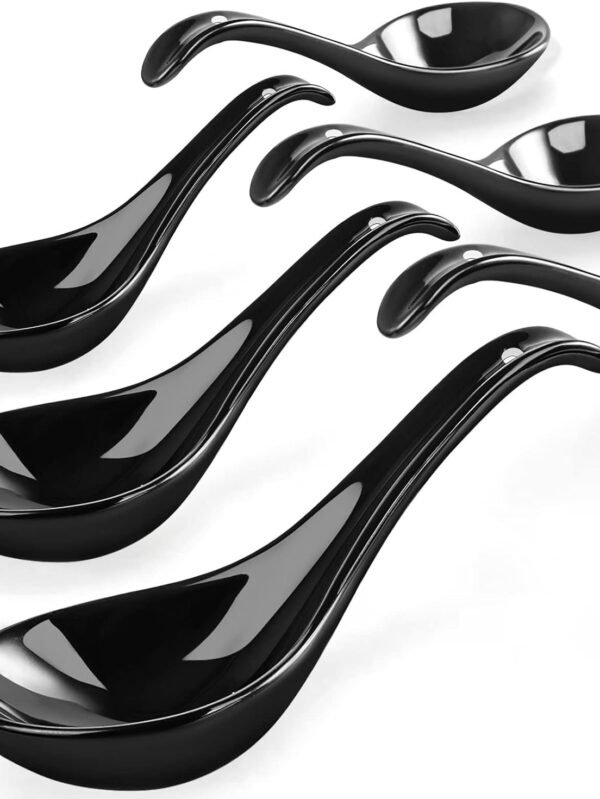 Soup Spoons, Black Ceramic Spoons Set of 6, Chinese Soup Spoons, 6.75 inch Ramen Spoons, Pho Spoons for Cereal, Noodles, Stews, Wonton, Dumpling, Miso, Deep Oval Hook Design, Dishwasher Safe