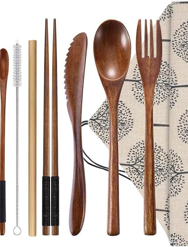 Wooden Utensil Flatware Set Reusable Utensils Travel Cutlery Set for Eating with Case, 10 Pcs Wooden Spoon and Fork Set Bamboo Flatware Set with Wooden Knife, Fork, Spoon, Chopsticks, Straws and Brush
