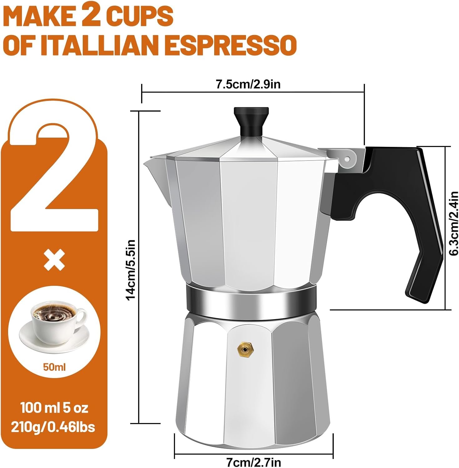 - Size: Standard espresso coffee cup is 50 ml. 2 Cup/3.3 oz/100 ml; 3 Cup/5 oz/150 ml; 6 Cup/10 oz/300 ml; 9 Cup/15 oz/450 ml; 12 Cup/20 oz/600 ml; 14 Cup/23 oz/700 ml. Mocha Coffee Maker with strong aroma can make delicious espresso for you in 5 minutes, you will be impressed by its rich flavor and aroma immediately. TIP: It is recommended to buy a larger capacity coffee pot to reduce your exchange troubles