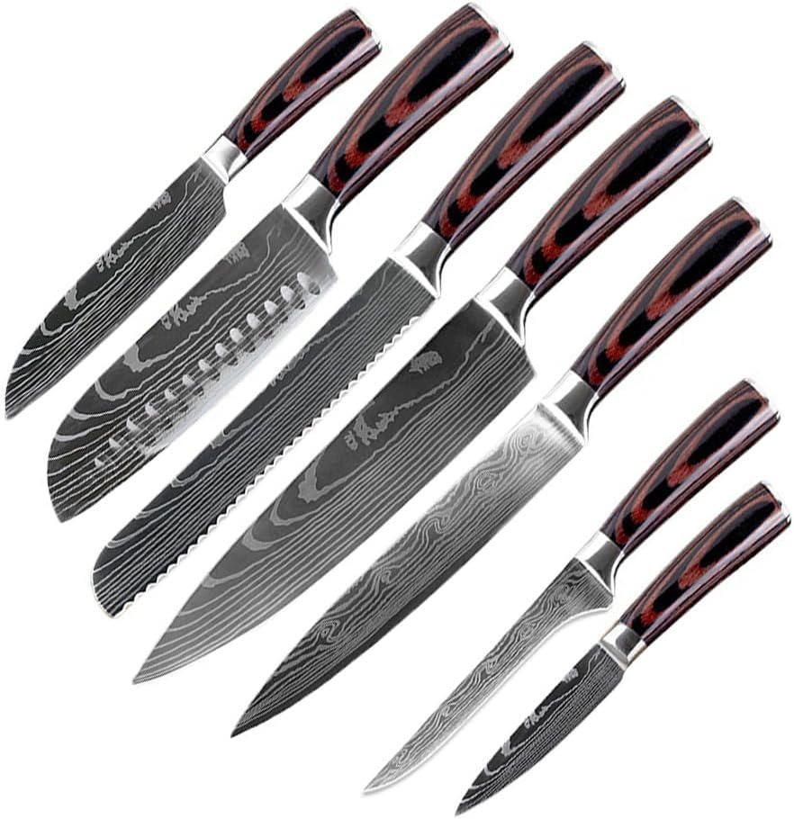 - [Comprehensive knife set] This is a perfect way to start a new knife set: 1x 8″ chef knife, 1 x 8″ slicing knife, 1 x 8″ bread knife, 1 x 5″ santoku knife, 1 x 5.5″ boning knife, 1 x 5″ utility knife, 1 x 3.5″ paring knife. Perfect for busy kitchens. A best gift for professional chefs and beginners.