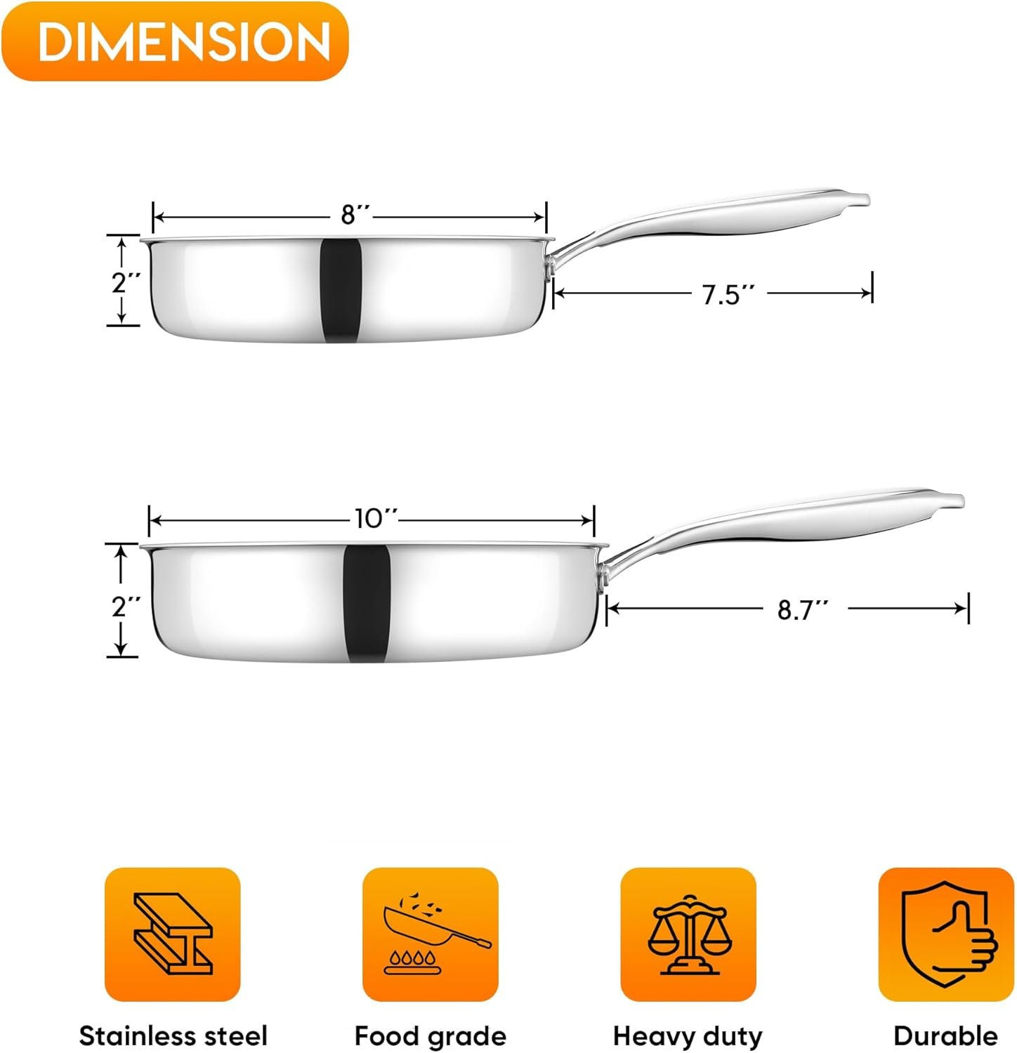 8″ and 10″ Nonstick Frying Pan Set, Tri-ply Stainless Steel Skillet Fry Pan for Cooking Omelets Egg Steaks, Induction Ready & Oven Safe, Stay-Cool Handle & Compatible with All Stoves